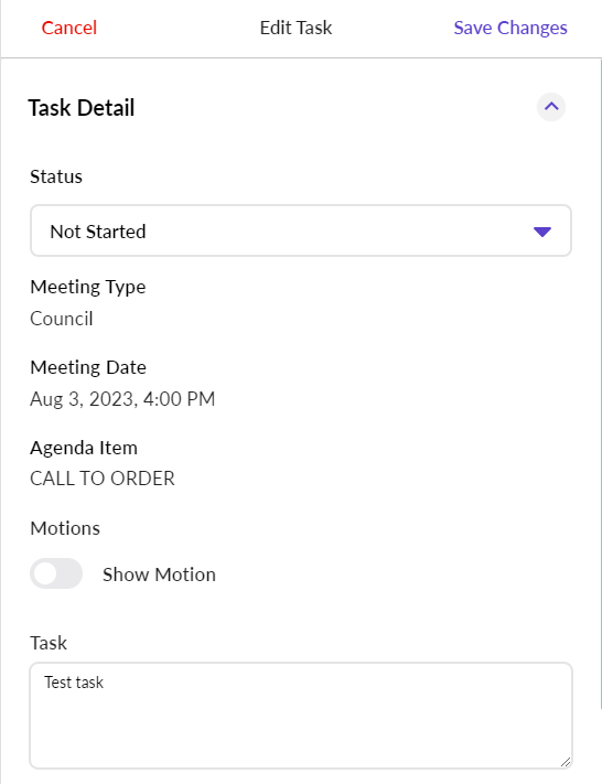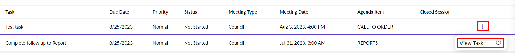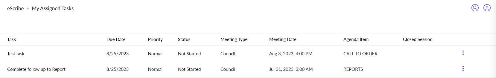 The My Assigned Tasks screen list will display any tasks from meetings where you have access. This level of access is determined by your user role, and can be configured by Portal Administrators and eSCRIBE Administrators with sufficient privileges.