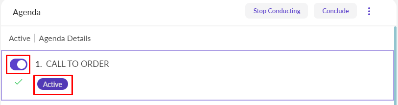 Go to Main Navigation Bar > Meeting > select specific Meeting > select specific Agenda Item >click on Active toggle