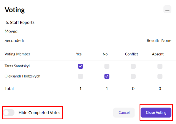 Select the option Hide Completed Votes to have Voting Participants' votes disappear from the list, when their vote is cast. This is helpful especially for organizations with a large number of voting members.