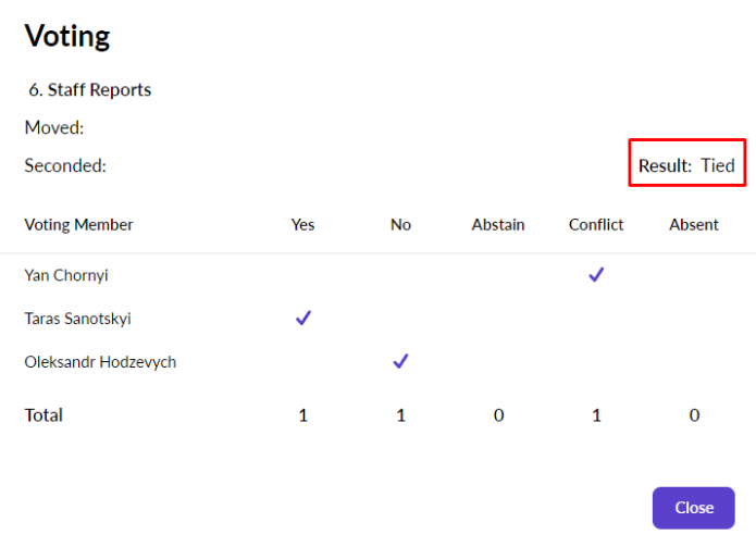 Once all votes have been cast, the Administrator will click Close Voting to calculate the result of the vote.