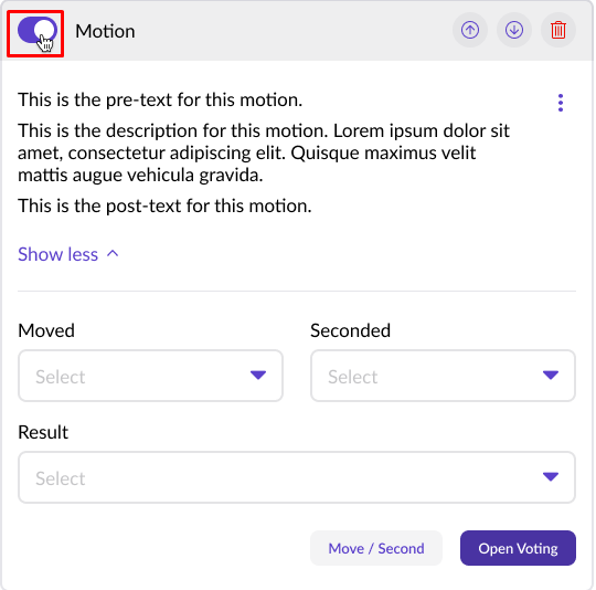 To preview an individual resolution on the public display click on the toggle for the specific motion. The toggle will turn purple and the resolution will appear to the Public Display including the decision text, mover and seconder.