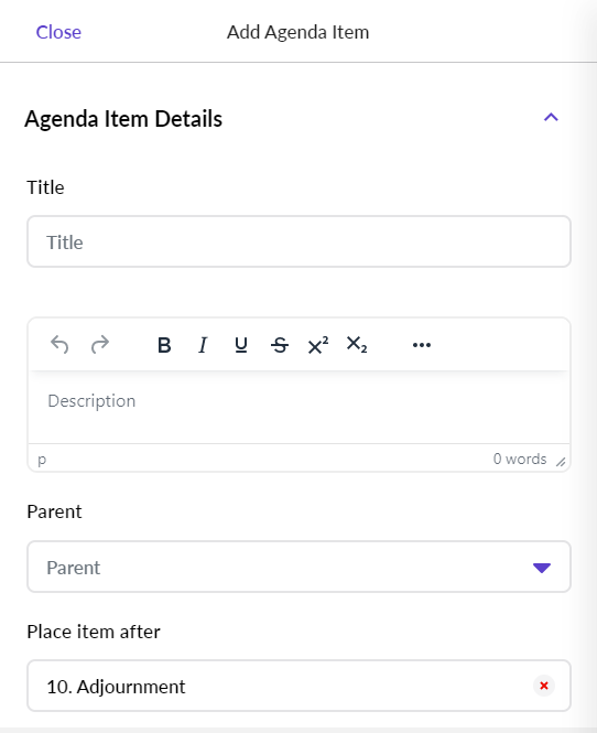 To add a Category (parent agenda item) or Item (child agenda item) to the structure, simply complete the mandatory fields on the form: