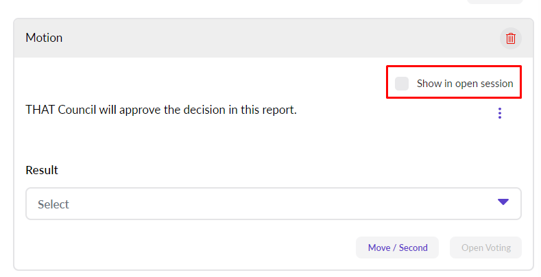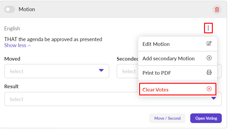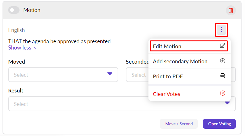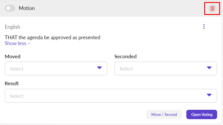 Administrators will also be able to Delete the Vote by clicking the delete icon at the top right corner of the motion.