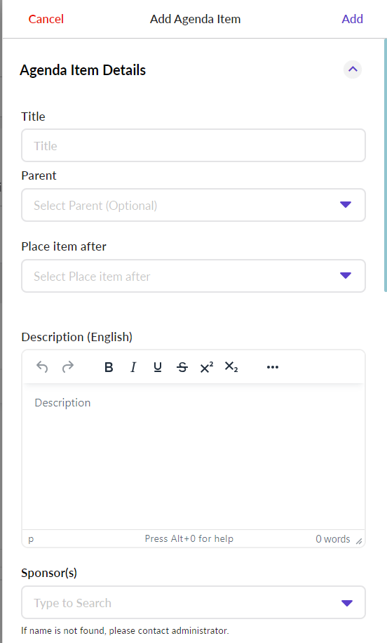| Parent | Selecting a "Parent" where the new item will be placed under an existing item. If parent value is not selected, the new item will appear at the bottom of the agenda. |