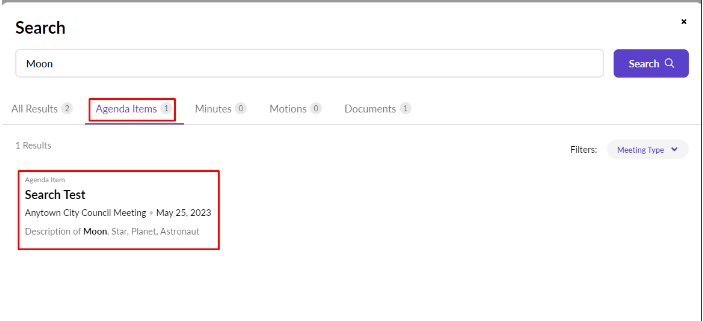When searching for Agenda Items, Minutes, Motions and Documents, clicking on the appropriate search result will bring the user to the agenda and highlight the result on the Agenda's Navigation, and will highlight the result on the Agenda Item's Details. You will need to return to Meetings from the Main Navigation Bar to get back to Keyword search to find another word.