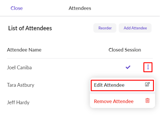 When you open Attendees from the Action Menu in a specific meeting, you can select the Option Menu for a specific attendee to view and click on Edit Attendee.
