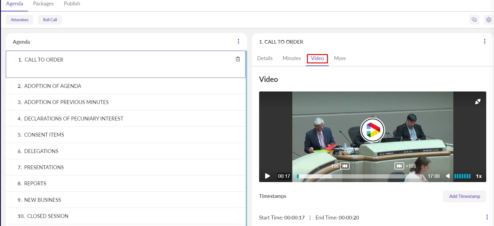 If an item was not visited during conduct meeting mode, but you wish to add a bookmark, simply select the item and click on Add Timestamp below the video.