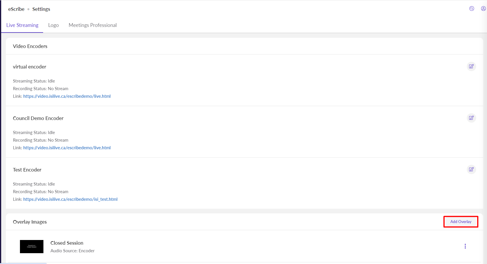 To add an additional video source, click the Add Overlay link below the list of video encoders.