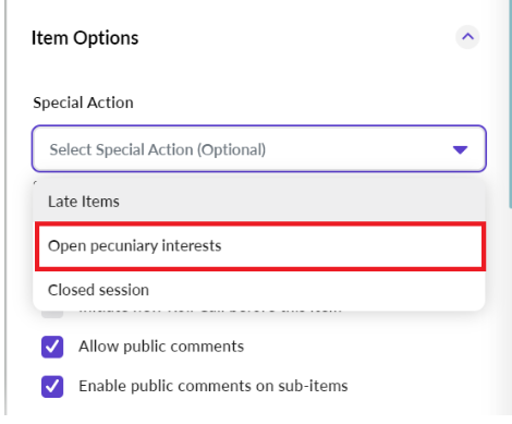 When creating an item for conflict of interest on your agenda template, select Open Pecuniary Interest from the Special Actions drop down menu.