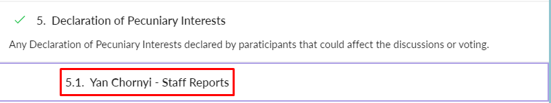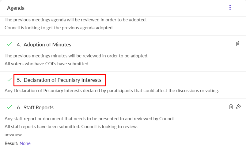To add a conflict using the special action item, select the agenda item that has the special action. For example, Declaration of Pecuniary Interests from the agenda navigation.