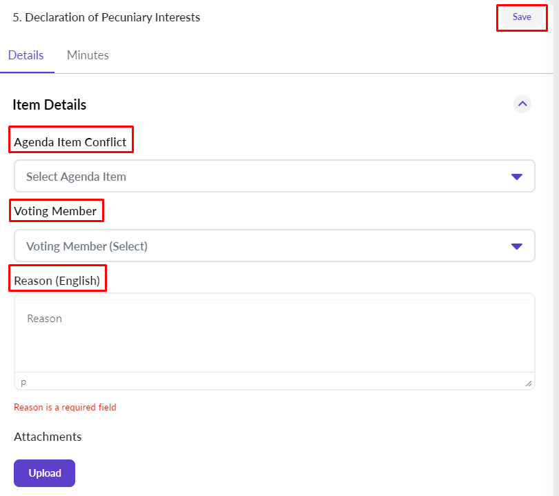On the right-hand side of the screen, select the agenda item and voting member, and enter a reason for the conflict.
