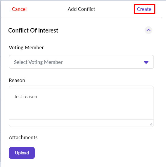 The following form will appear as a fly out which will allow you to select a voting member from the drop down, enter a reason for the conflict and add attachments.