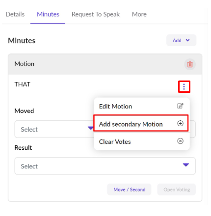 - Main Motion as Amended - Selecting this type of motion will create a new vote, pre-populated with the text “Motion as amended”. This option is only available if there is an amendment to the main resolution, and a secondary motion is added to the main vote.