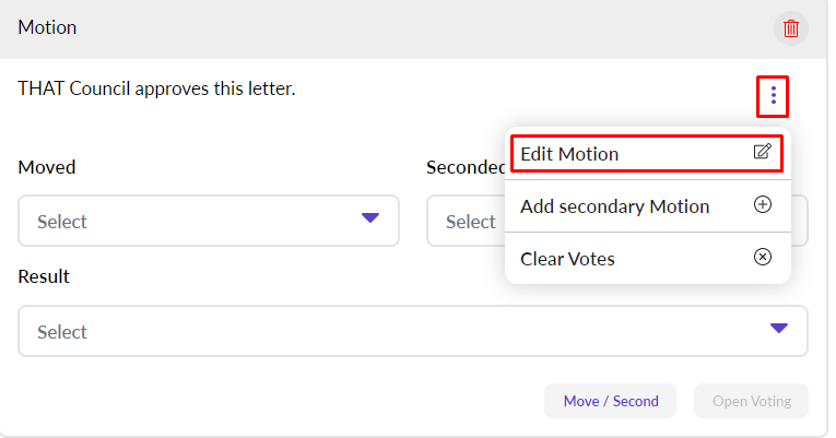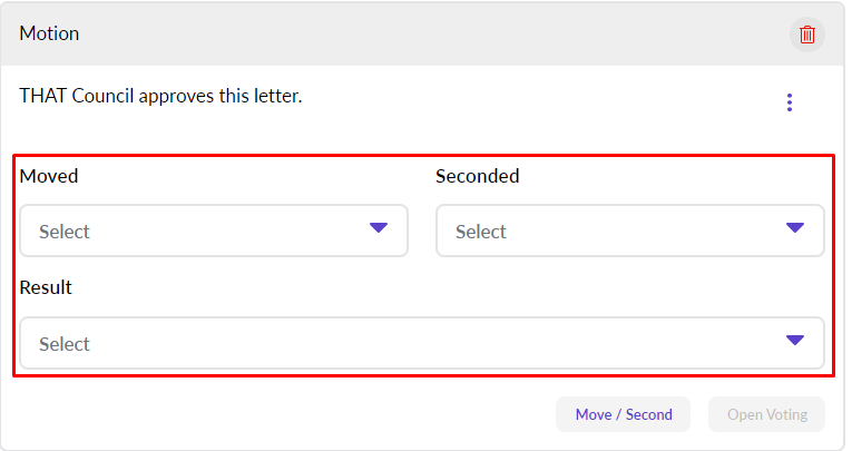 For most resolutions, simply choose a mover, seconder and result. Alternatively, if using eSCRIBE’s Vote Manager, you can click Open Voting to start the electronic voting process.