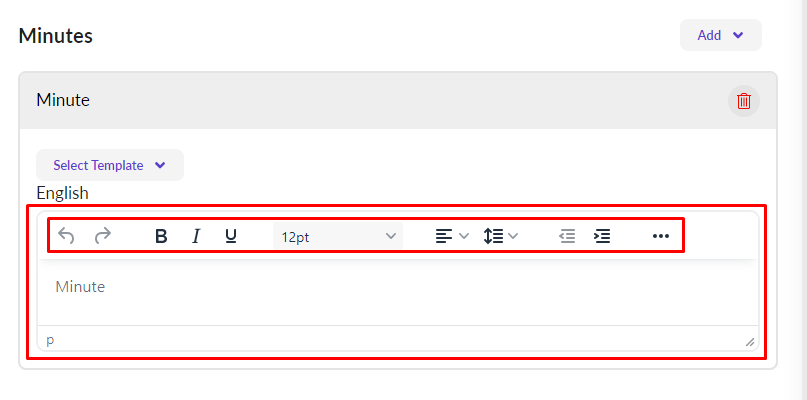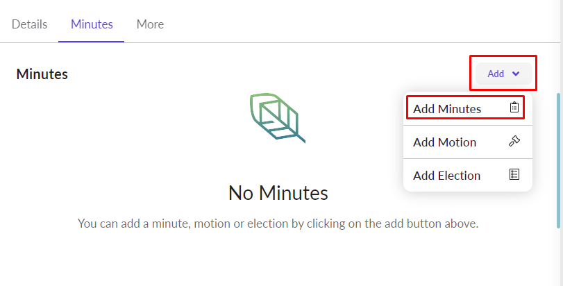 Go to Main Navigation Bar > Meeting > select a Meeting > select an agenda item > Minutes (agenda item's tab bar) >Add drop-down menu > Add Minutes