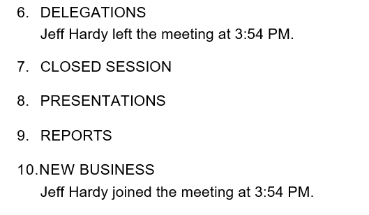 eSCRIBE will generate a line item on the minutes package when the Roll Call function is utilized when an attendee has left and re-entered the meeting. Your minutes package may resemble the following image below: