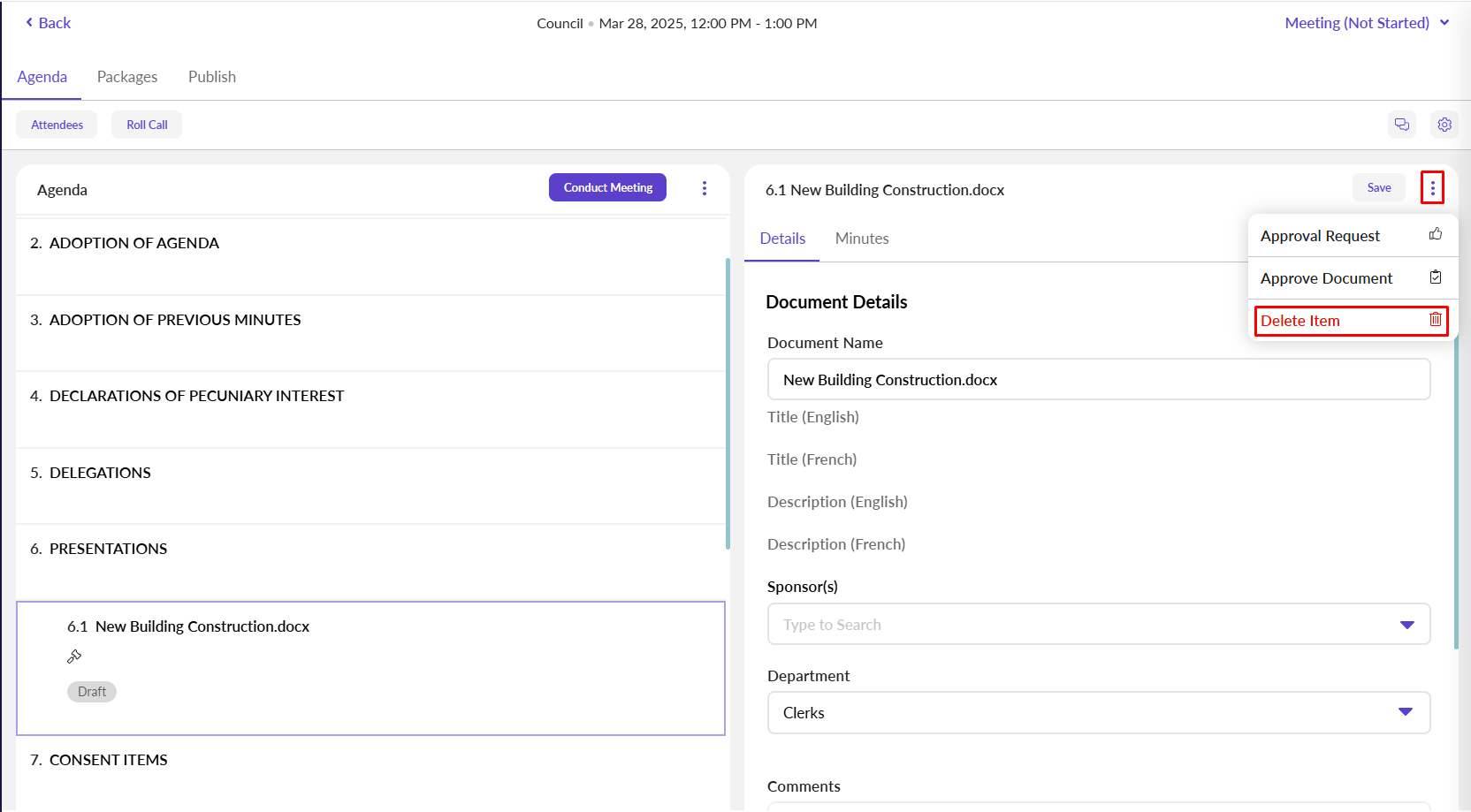 From the Document List, you can locate the draft agenda item and click on the icon to delete the item.