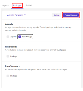 Inside the Closed Session, navigate to the Packages tab from Tab bar. Prepare the Full Agenda Package just as you would in the Open Session to see or print a copy of the Agenda PDF Package. Otherwise, simply move to the Publish tab, to give your Participants access to the Closed Session.