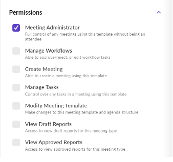 When duplicating the Meeting Template, review the Permissions Section. This area of permissions can dictate which different levels of control a specific user will have with this template. Meeting Administrators will have full access to the Closed Session Meeting Template. Meeting Type Administrators will be able to update the Closed Session Meeting Template (settings and agenda template).