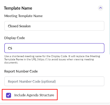 By selecting Include Agenda Structure, the overall structure of the meeting is copied including categories, sub-items, and default text (resolutions, minutes, etc.). If this option is not selected, then only the meeting template will be copied, and the agenda structure for the new meeting template will be blank.