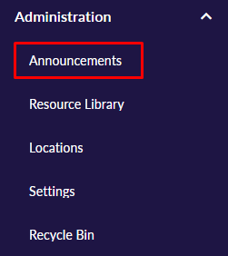 To create an Announcement, select Announcements from the Administration drop-down in the Main Navigation Bar.