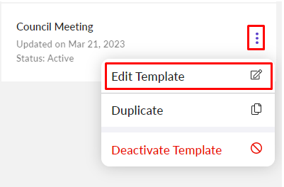 After you have uploaded your new logo into eSCRIBE, you would go to Meeting Templates from the Main Navigation Bar. From there, you would go into the options menu of the Meeting Template you would like to update.