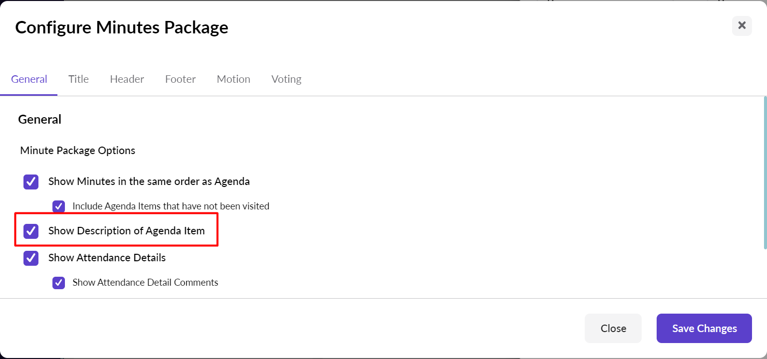 Under the General tab, the option Show Description of Agenda Item will allow you to either show the description of items in the Minutes package or not. Click Save Changes to apply the modification.