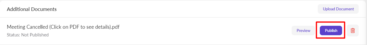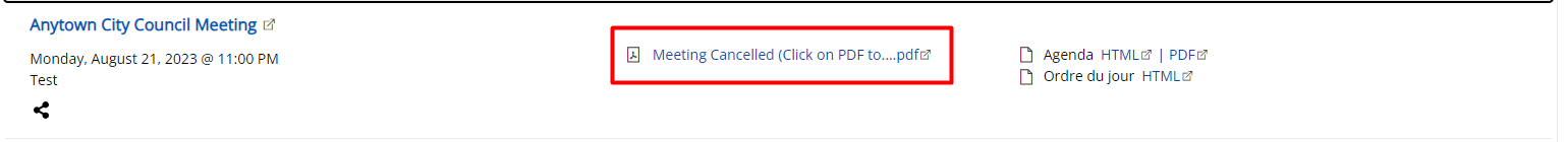 With using eSCRIBE's Internet Publishing module, you have the ability to publish your meetings to your website. Whenever you have a meeting that is cancelled and you need to notify the public about the cancellation, you can publish an "Additional Document" to accomplish this.